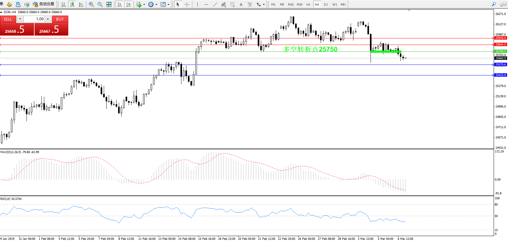 道琼斯指数DJ30—— 4小时K线图显示: