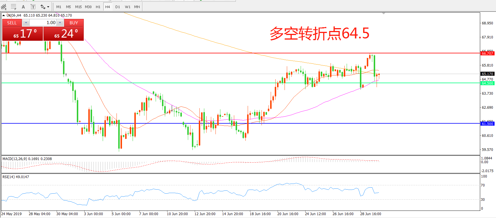 4小时图看,油价跳空高开,一度冲高至66.7美金后震荡回落,显示上方动能较强 均线系统逐渐粘合,MACD红柱减少, RSI指标走平,日内区间震荡概率较大。
