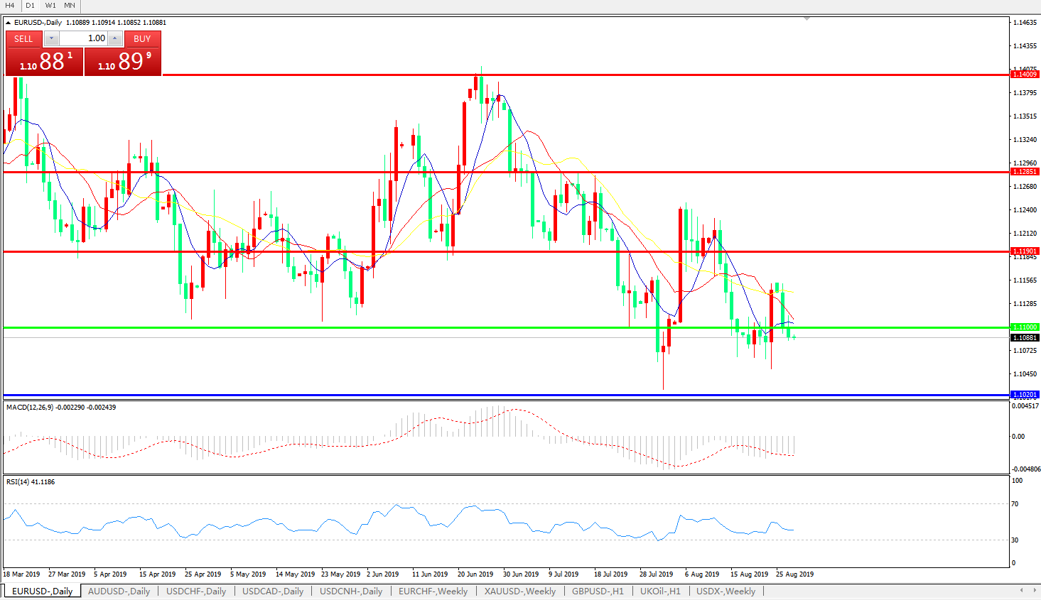 技术面简析:日图均线整体仍呈空头趋势,汇价延续回落态势小幅下行,MACD运行于0轴下方且动能柱量能维持,RSI缓步走低,预计短期存进一步下行空间,中期需持续关注欧央行宽松及美联储降息的预期及影响。