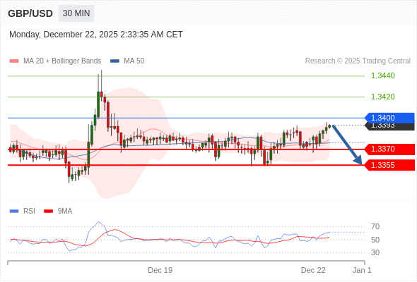 在 1.3400 之下,看跌,目标价位为 1.3370 ,然后为 1.3355 。