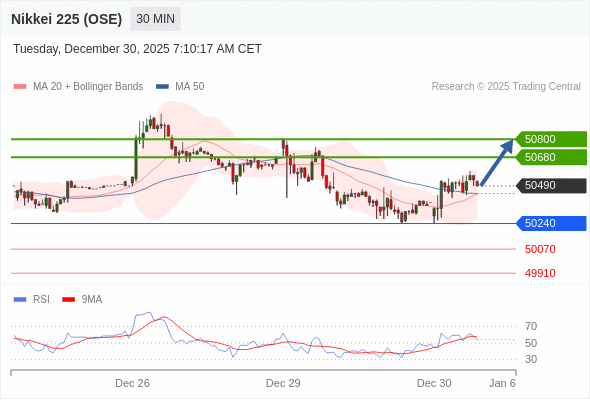 在 50240 之上,看涨,目标价位为 50680 ,然后为 50800 。