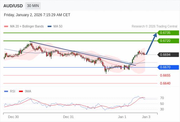 在 0.6670 之上,看涨,目标价位为 0.6720 ,然后为 0.6735 。