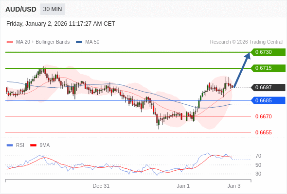 在 0.6685 之上,看涨,目标价位为 0.6715 ,然后为 0.6730 。
