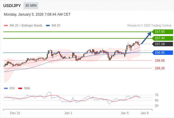 在 156.85 之上,看涨,目标价位为 157.40 ,然后为 157.65 。