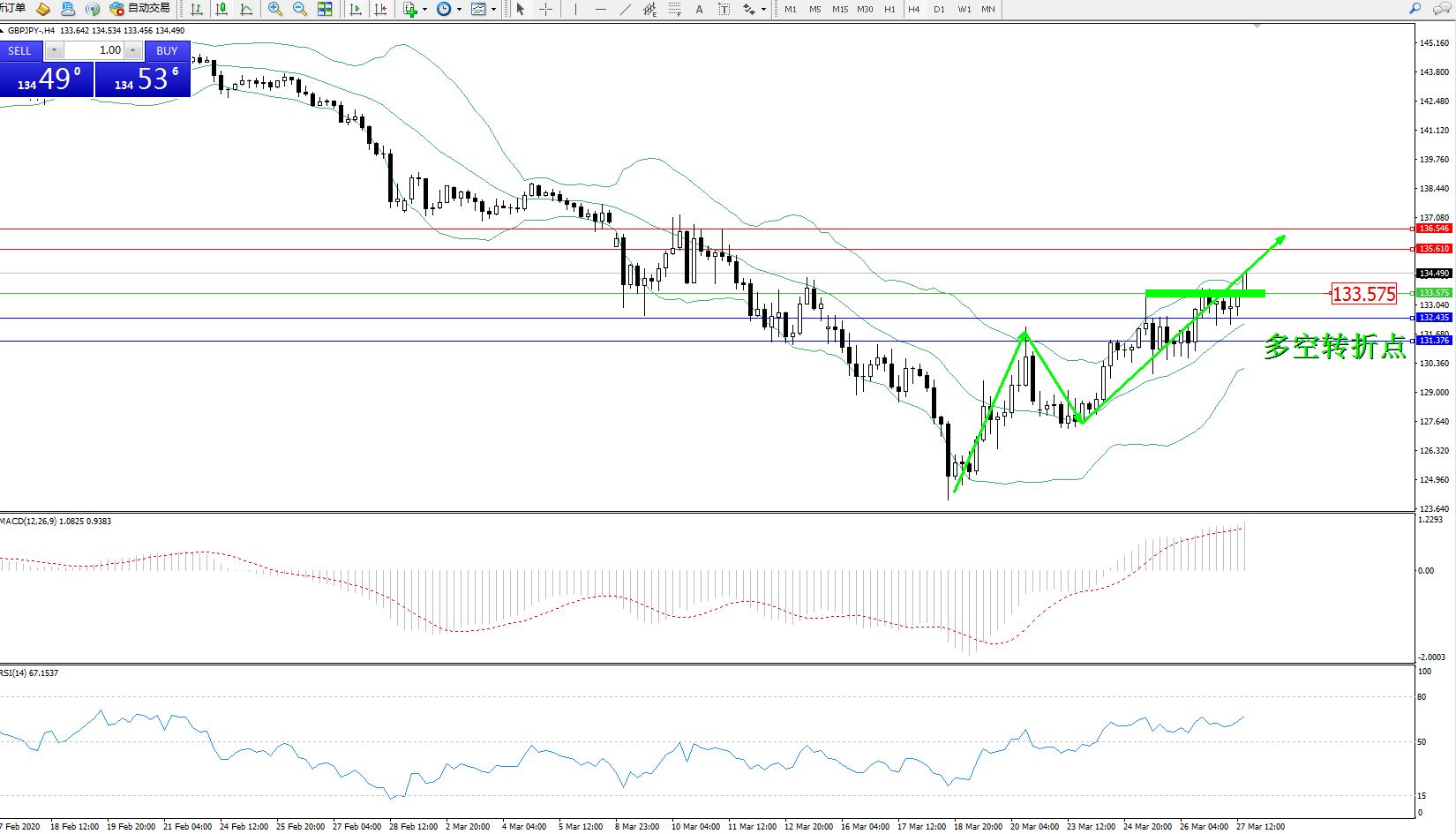 英镑兑日元刚刚触及134.00关口,最新报134.00,日图涨0.20%,英国3月服务业PMI创历史新低,3月综合PMI为历史新低,3月制造业PMI3个月新低。英国PMI数据突显疫情爆发对英国经济造成巨大打击,程度甚至高于全球金融危机最严重时期。采取额外的防控措施将在未来数月进一步使经济瘫痪;出现一场可能前所未见的大规模经济衰退的可能性越来越大。3月调查数据与GDP增速季率环比下降1.5%-2.0%相符,这一降幅足以使经济在第一季度陷入萎缩。然而,这一下降或只是冰山一角,且会变得微不足道,第二季度将见证疫情造成更大的损失和经济低迷。
