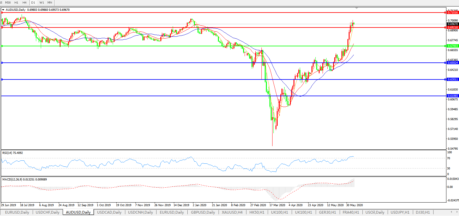 交易策略:0.6700上方看涨,目标0.6920、0.7100