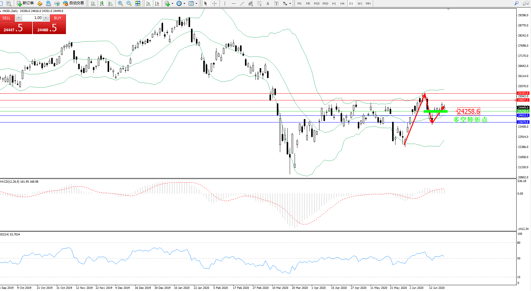 香港恒生指数622日(周一)收盘下跌132.55点,跌幅0.54%,报24511.34点;港股三大指数全日震荡收跌,国指跌0.96%9879点。南下资金净流入21.73亿港元,大市成交额为1195.81亿港元。半导体全日强势领涨,中芯国际大涨近6%逼近新高;生物医药B类股、手游股午后崛起,信达生物大涨超8%续创新高;腾讯与港交所力撑大市,且双双创下新高,分别大涨3%3.7%,贡献恒指130点。林郑月娥在“2020财新夏季峰会”上表示,未来一年,香港特区政府会加强推动建立跨境理财通机制,扩大香港居民异地见证开立内地个人银行结算账户的试点范围,推动交易所交易基金ETF纳入深港通等政策。