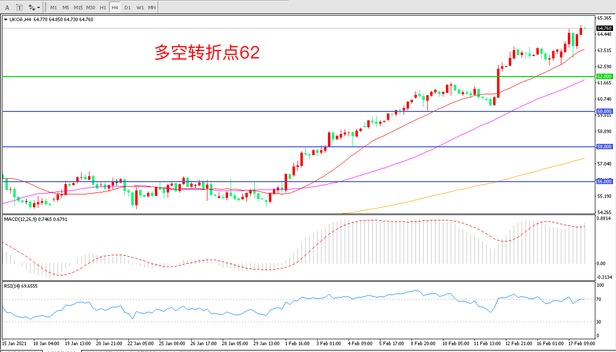 周四(2月18日)凌晨,根据美国石油协会公布的数据显示,当周API原油库存大幅减少580万桶,好于市场预期减,数据公布后,美油短线攀升,收报61.72美元/桶,涨幅扩大至2.78%。受假期因素影响EIA数据将于周五凌晨0:00公布如果该数据与API表现一致无异于火上浇油油价将迎来更大幅度的上涨