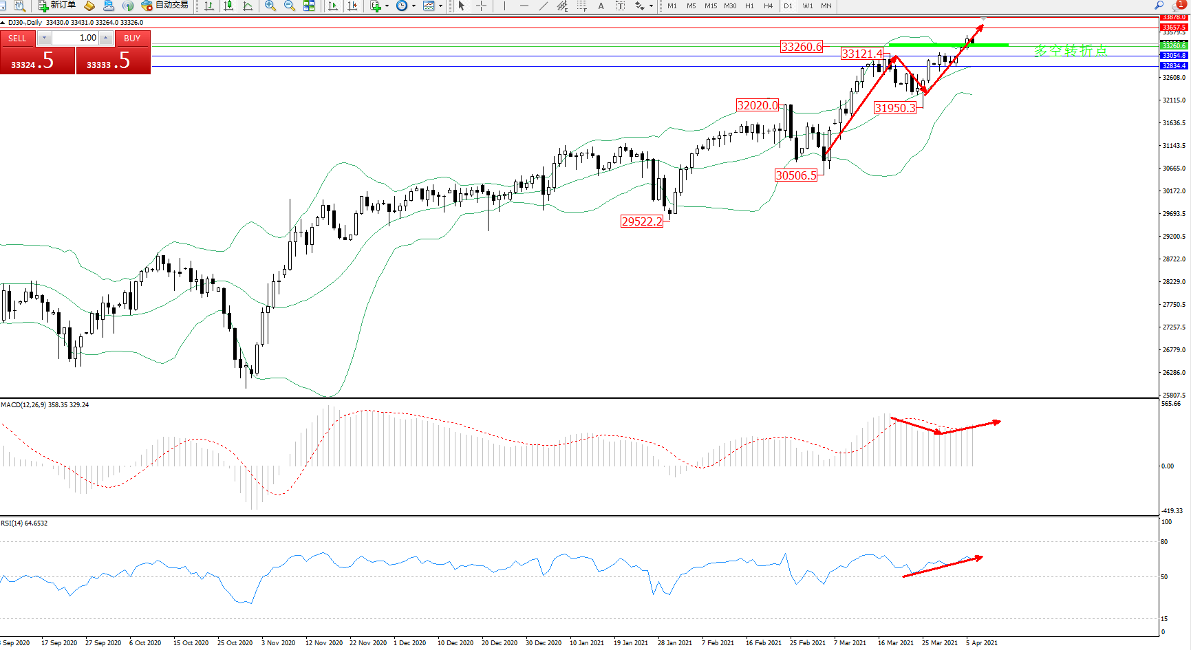 交易策略:33260上方看涨,目标33657、33878