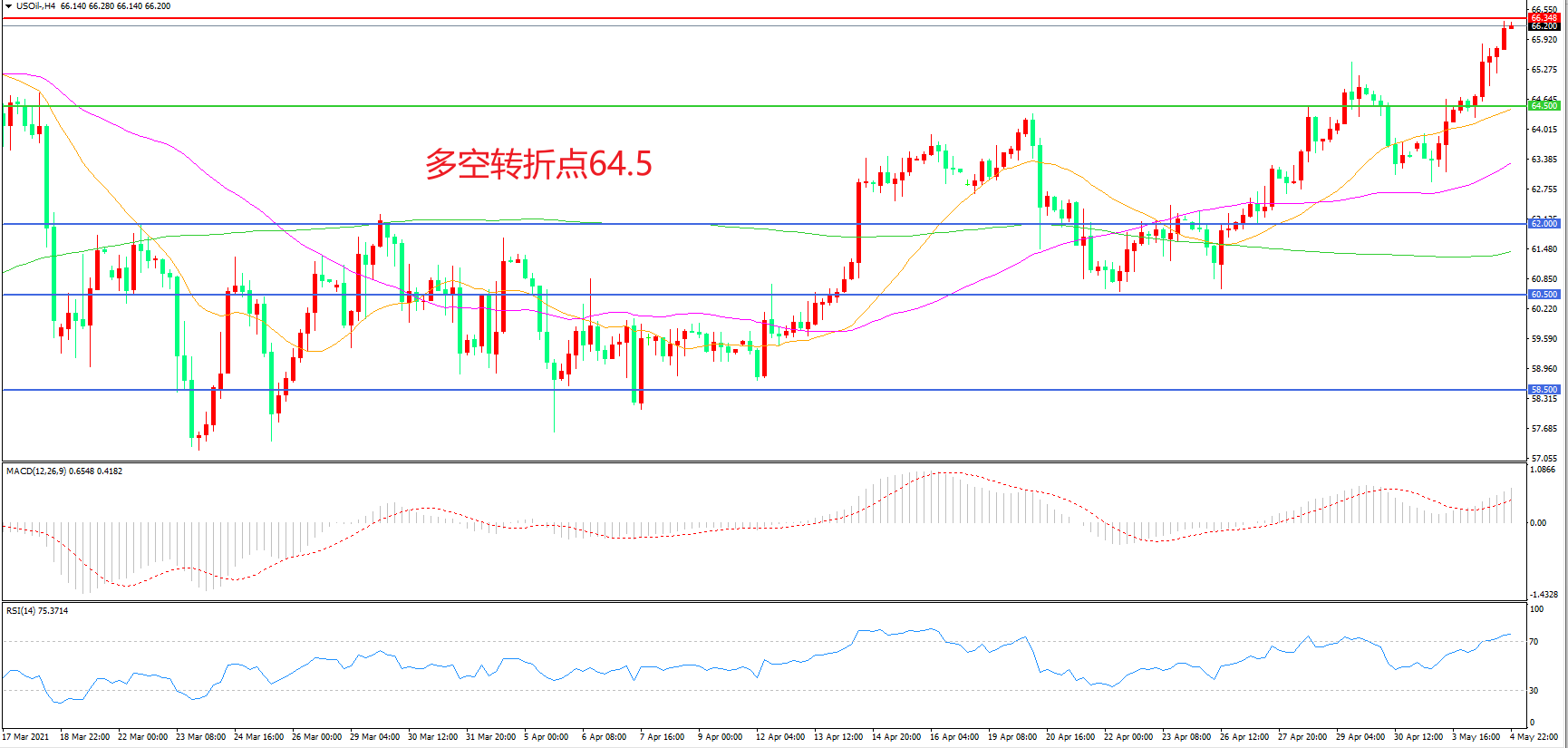 周二(5月4日),发达国家和主要新兴市场国家下半年需求强劲反弹的乐观情绪,盖过了印度全面封锁引发的担忧,各大投行轮番出场唱多油价为多头提供了良好的外部环境,美国WTI原油大幅上行后,收报66.18美元/桶。随着夏季需求旺季的来临,加上美国、英国和欧洲部分地区正在重新开放,原油需求也迎来了爆发的希望。