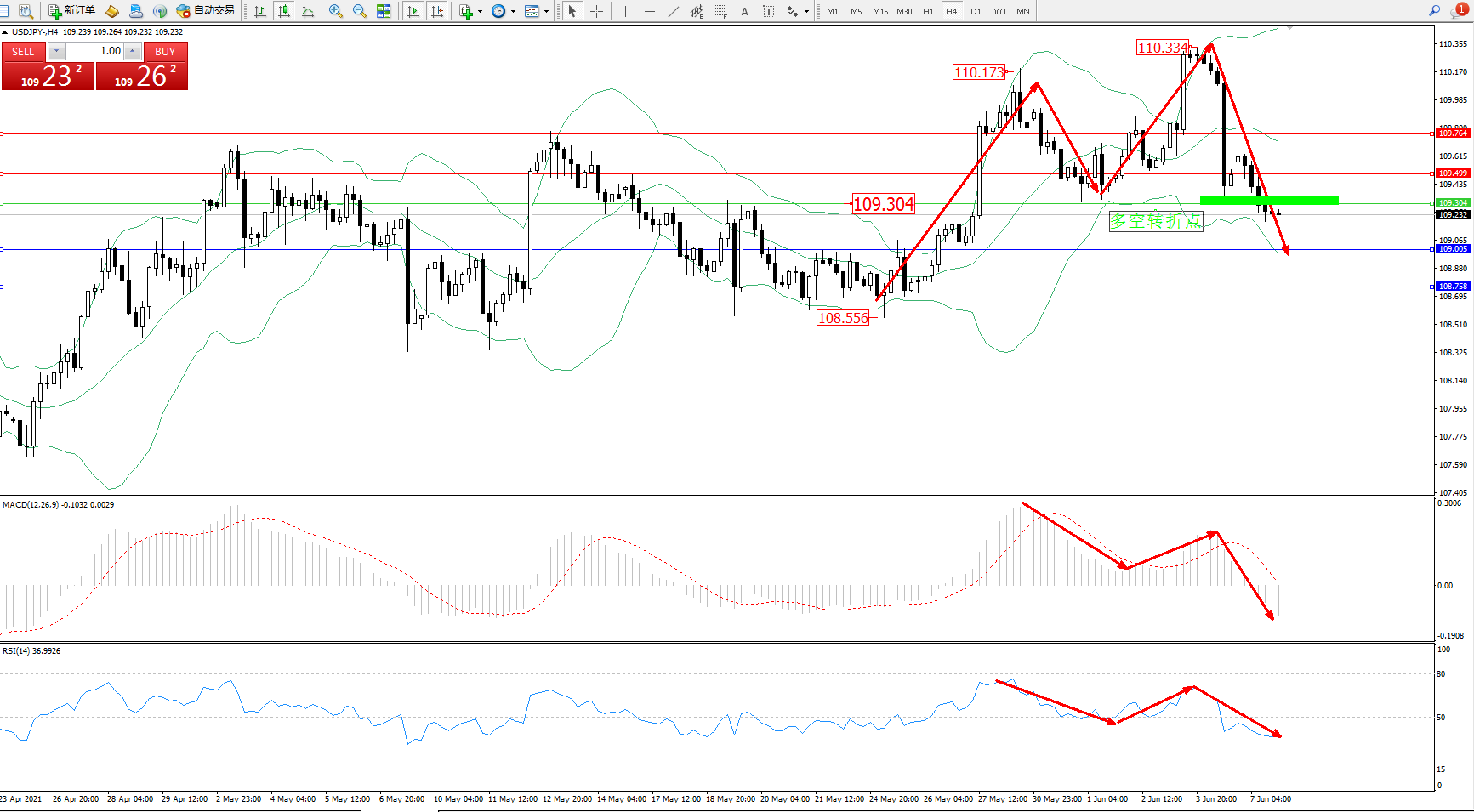 技术点评:长时间维持宽幅震荡处于布林带指标通道内震持续拉升,高位抵达110.334位置后遇阻回撤,处于布林带指标中下轨区间弱势不断向下移动,布林带指标呈张口走势持续中,跌势短期或将维持弱势,MACD指标处于空头动力持续震荡下破0轴线附近不断向下移动中,RSI指标处于50均衡线附近不断震荡后维持在空头区域弱势徘徊;