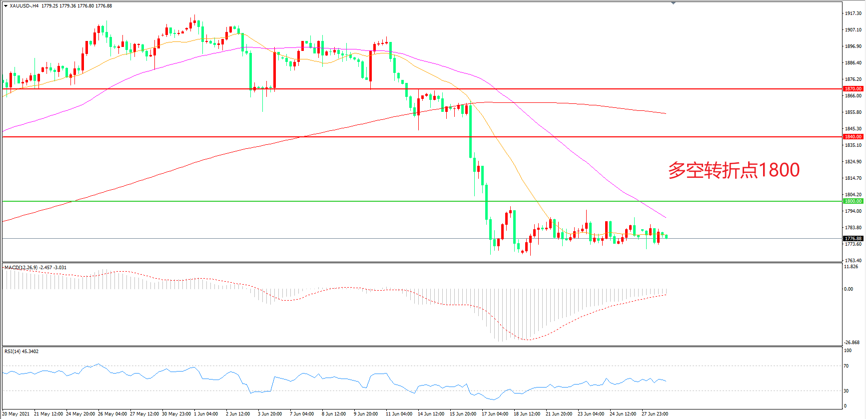 4小时图看,金价延续低位震荡,短线跌势有所缓解,但空头趋势依然明显,1800成为短期阻力,MACD绿柱缩短,RSI指标走平,日内震荡下行概率较大。
