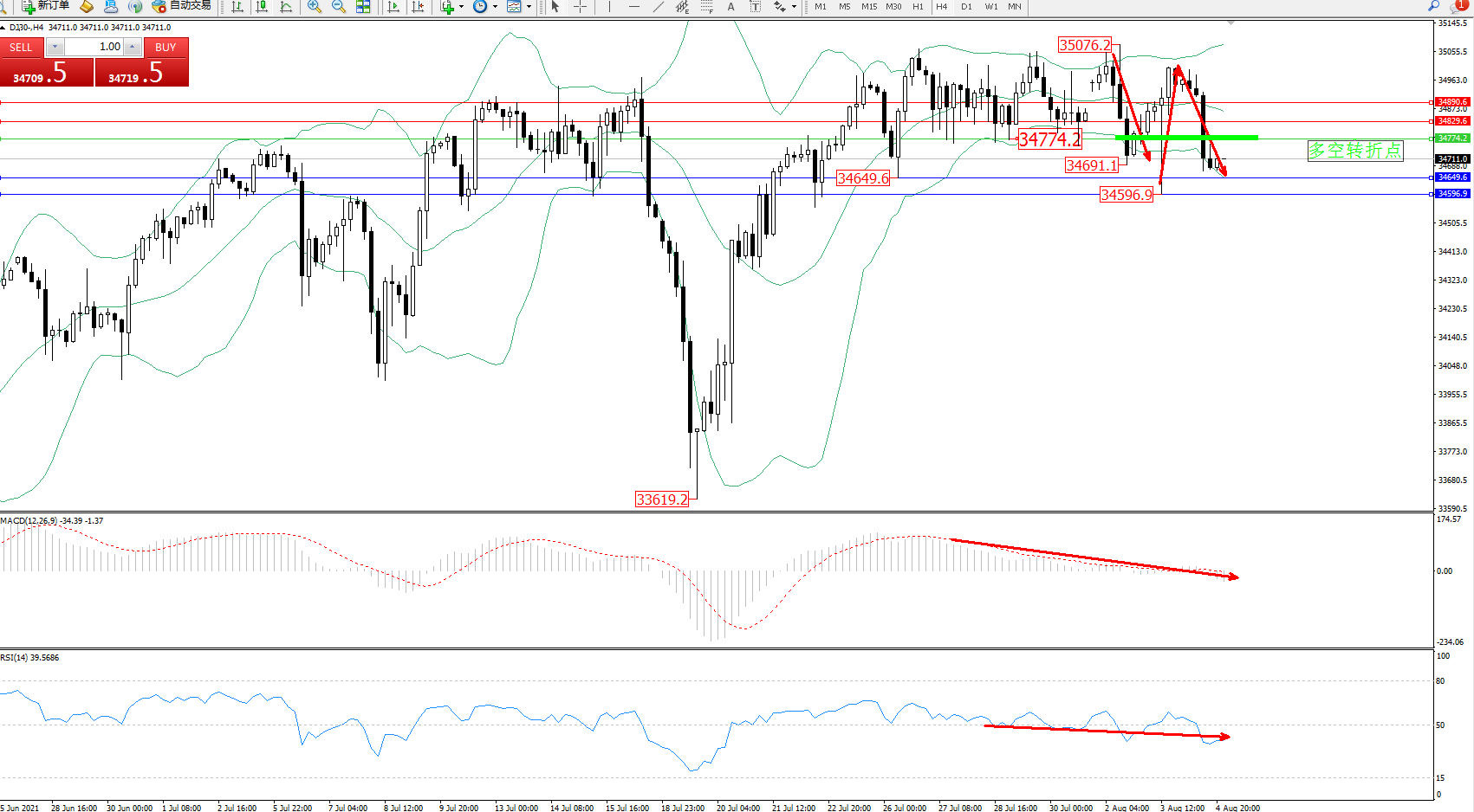 道琼斯指数DJ30——4小时K线图显示: