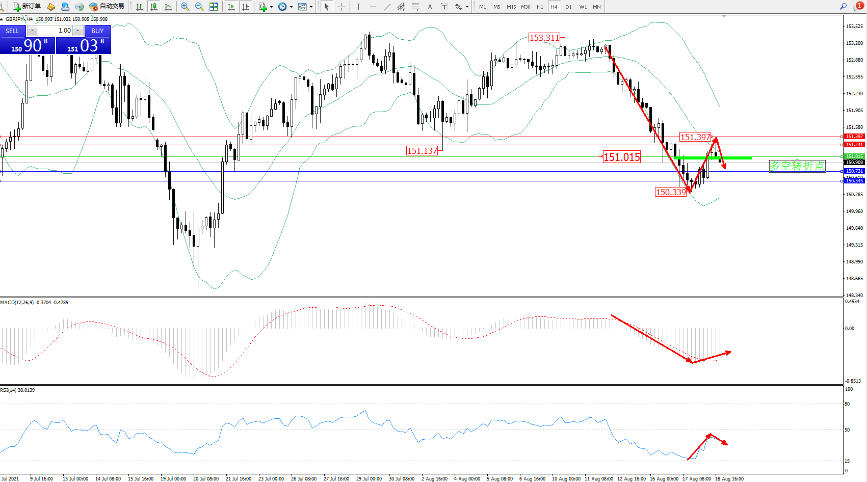 技术点评:空头动力延续布林带指标通道中下轨区间持续震荡下行,低位抵达150.339位置得到短暂支撑反转上移,突破中轨位置后遇阻回撤,空头下行动力强劲,布林带指标呈收口走势中,MACD指标处于空头区域低位震荡缓慢上移,RSI指标处于空头区域低位震荡上移后开始反转下行;