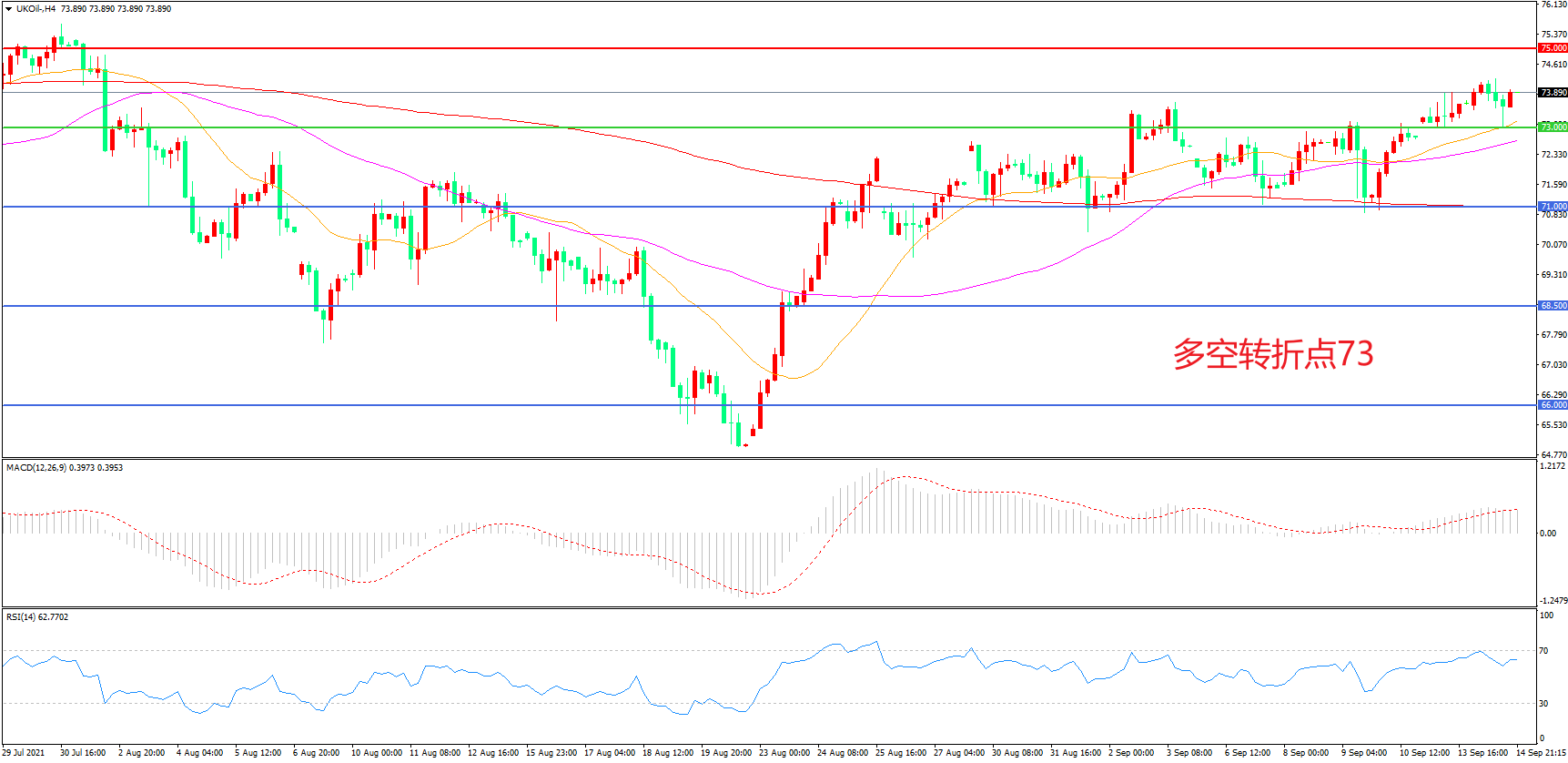 4小时图看,油价以73美元为依托震荡上行,短期走势有所回暖,均线系统逐渐发散,MACD红柱增加,RSI指标走平,日内震荡上行概率较大。