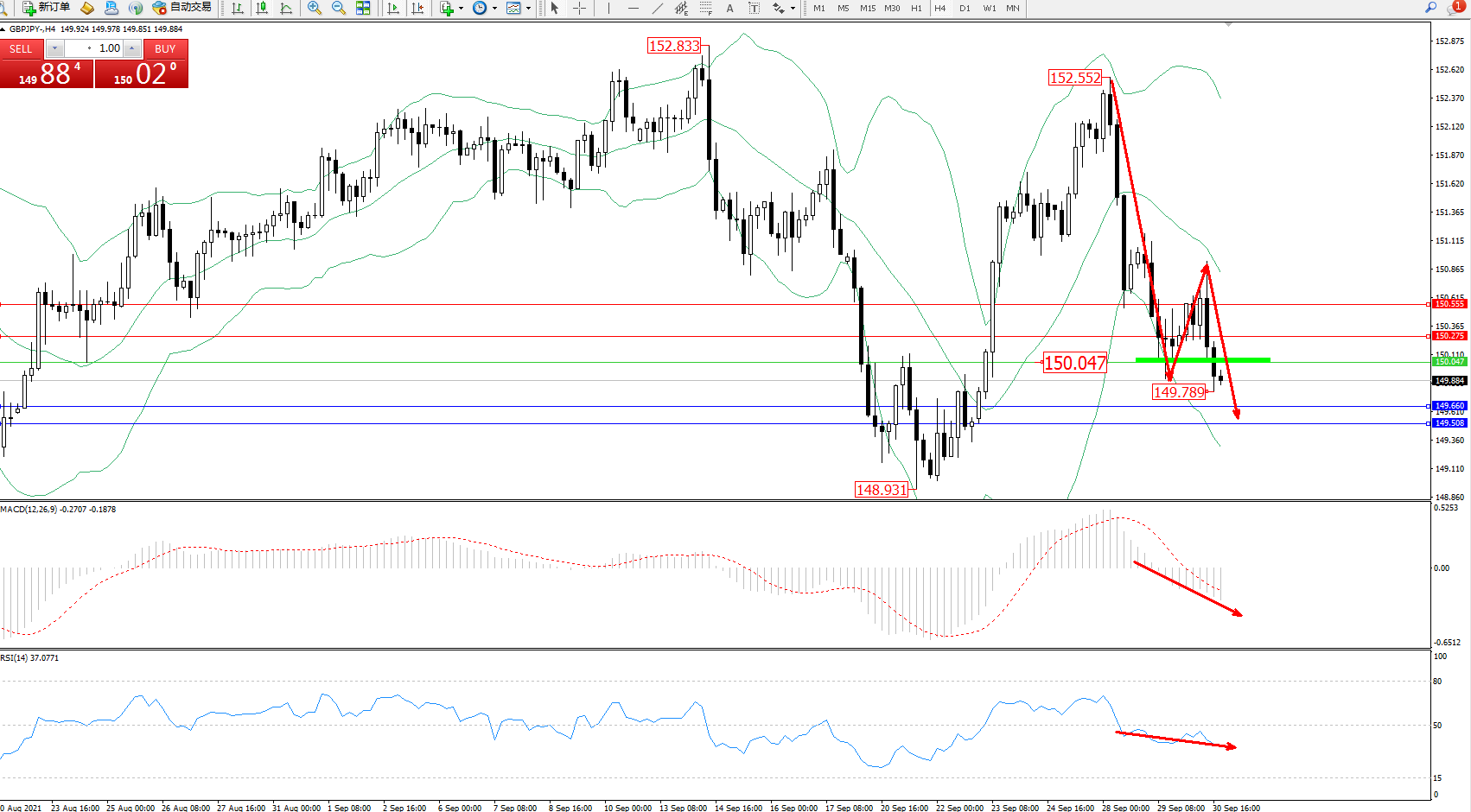 交易策略:150.047下方看跌,目标149.660、149.508