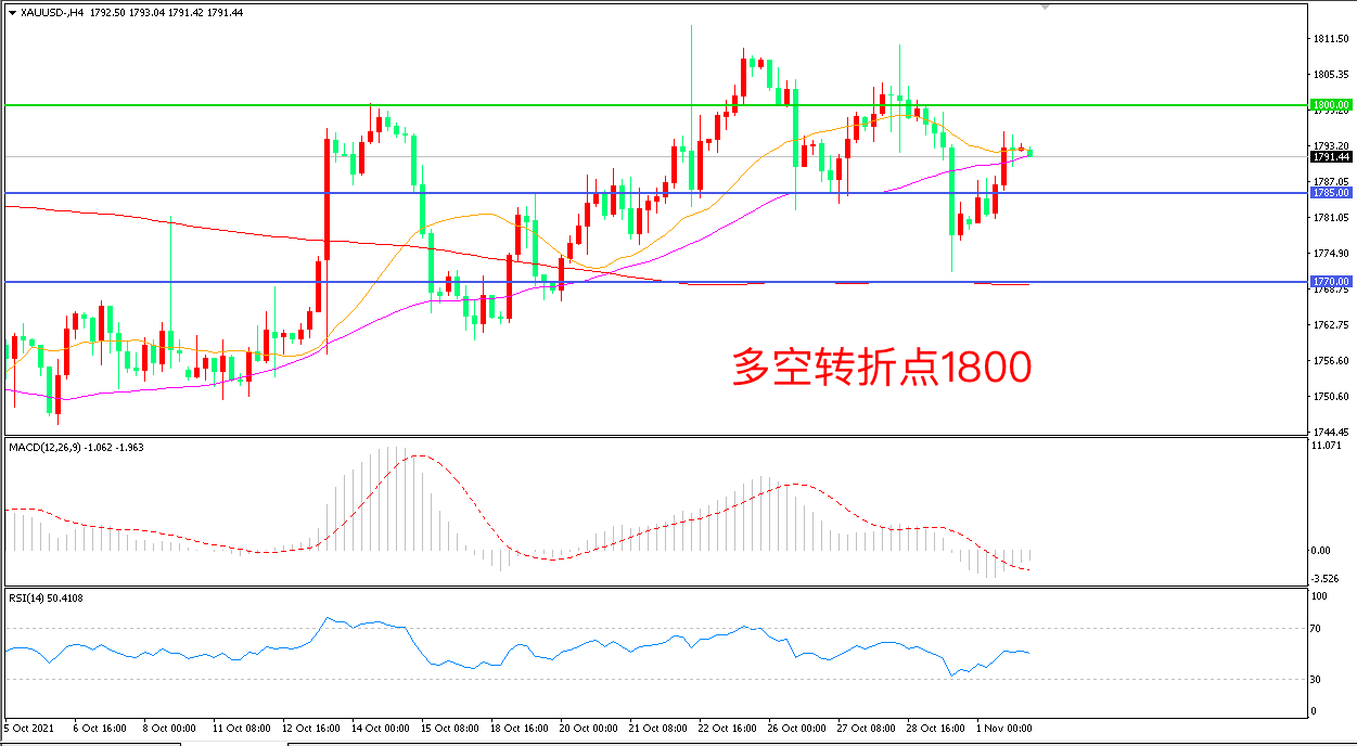 周一(11月1日),全球所有目光都聚焦在美联储利率决议上,除此之外,美国还将公布10月非农就业数据,重磅数据来临前投资者观望情绪较浓,现货黄金小幅反弹,收报1792.23美元/盎司。市场普遍预计美联储将宣布解除每月1200亿美元的债券购买计划,并在明年年中完全结束该计划,如果实际决策与此不符,将掀起金融市场的惊涛骇浪。