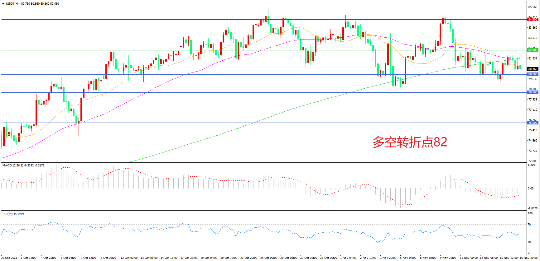 4小时图看,油价整体呈现区间震荡形态,均线系统粘合成为上方阻力,80美元成为短期支撑,MACD绿柱缩短,RSI指标走平,日内震荡下行概率较大。