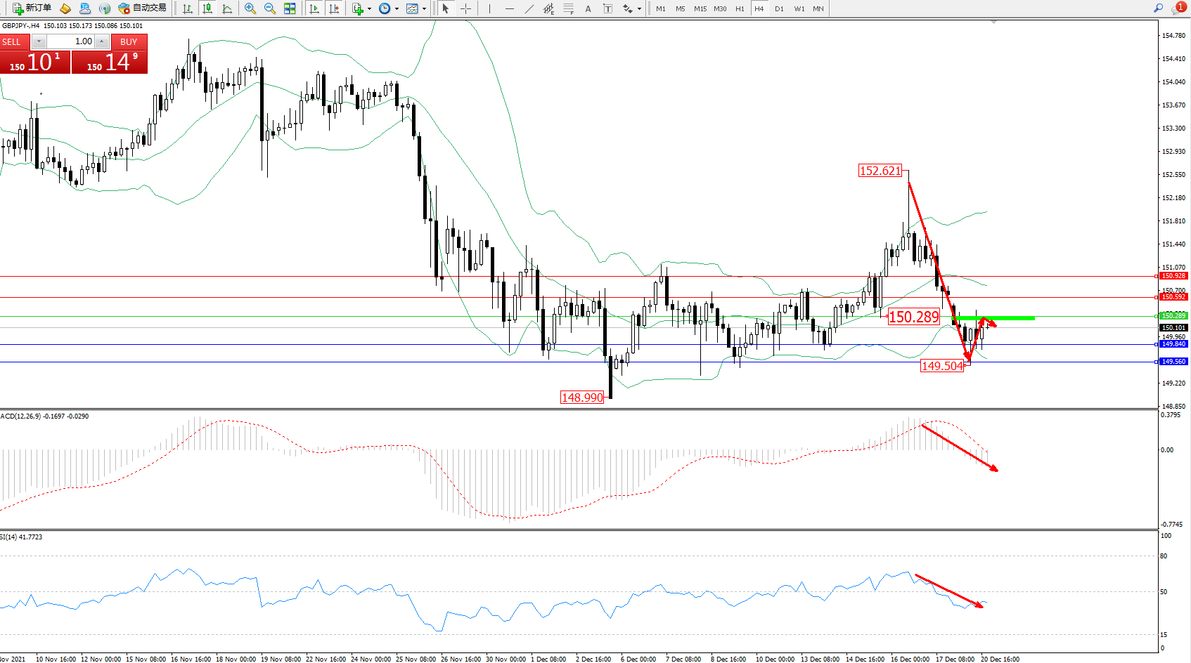 交易策略:150.289下方看跌,目标149.840、149.560