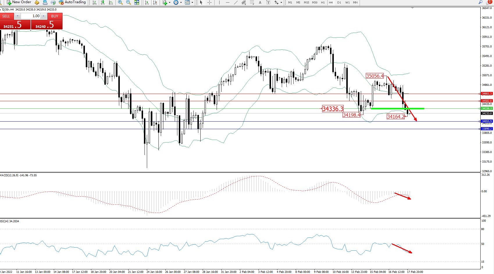 交易策略:34336下方看跌,目标34055、32890