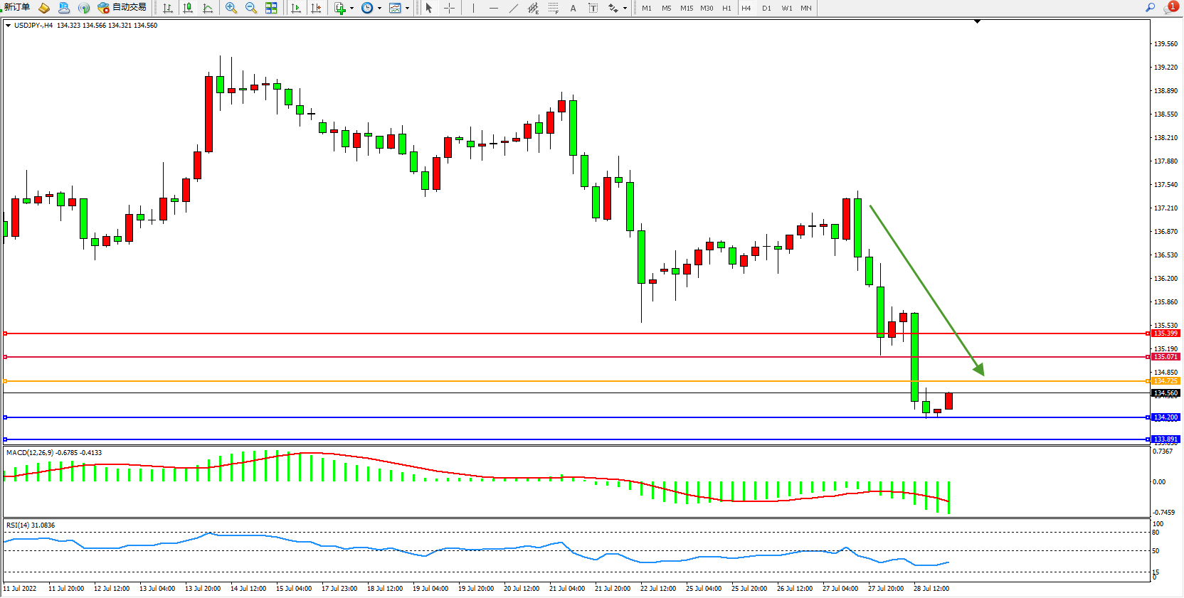 交易策略:134.725下方看跌,目标134.200、133.891