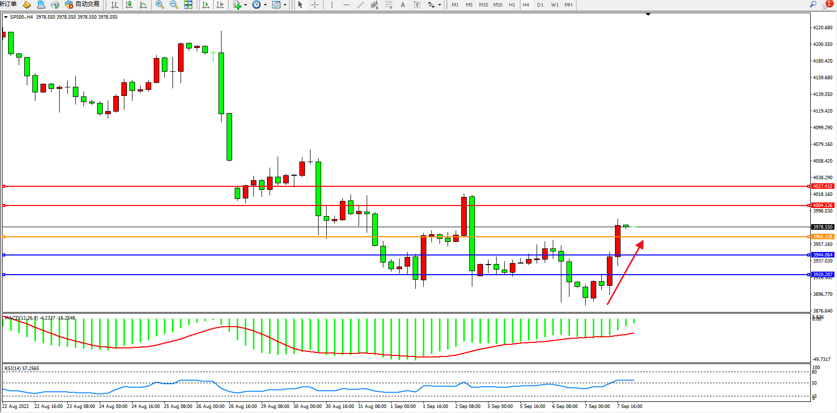 标普SP500——4小时K线图显示: