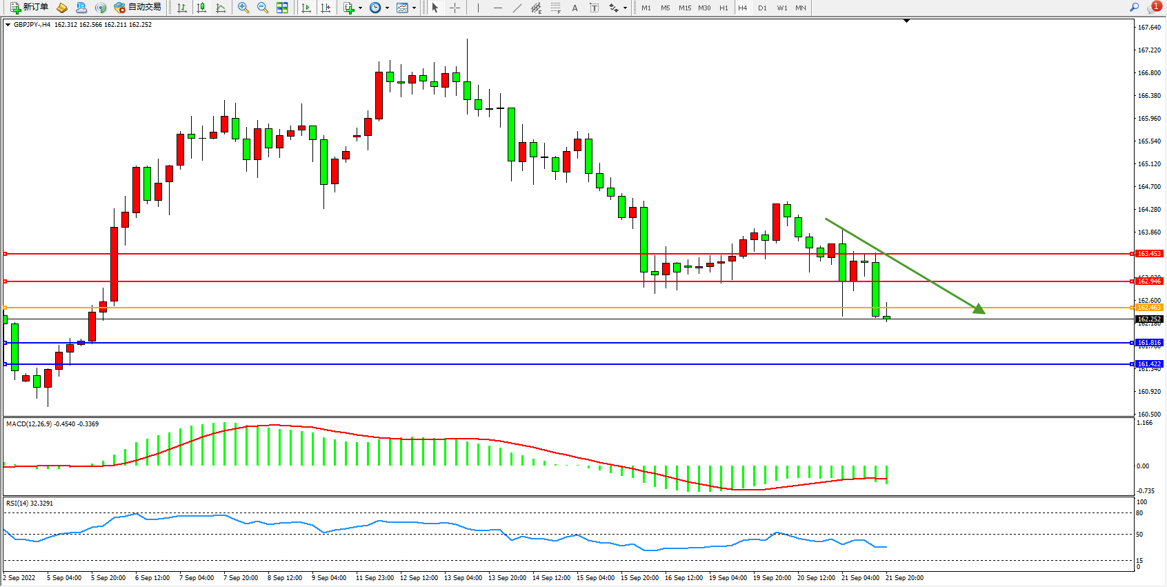 备选策略:162.463上方看涨,目标162.946、163.453