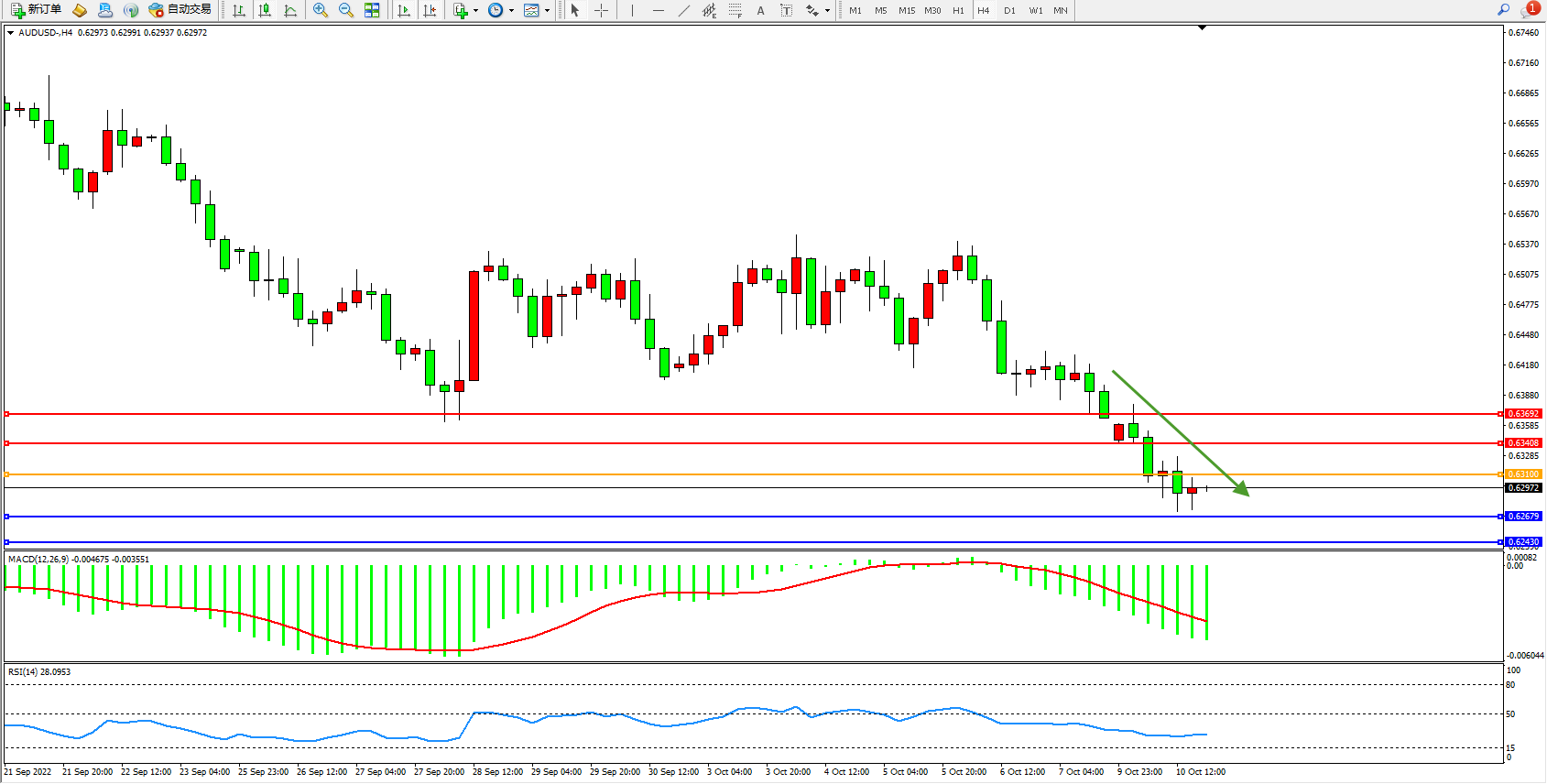 澳元美元AUDUSD——4小时K线图显示: