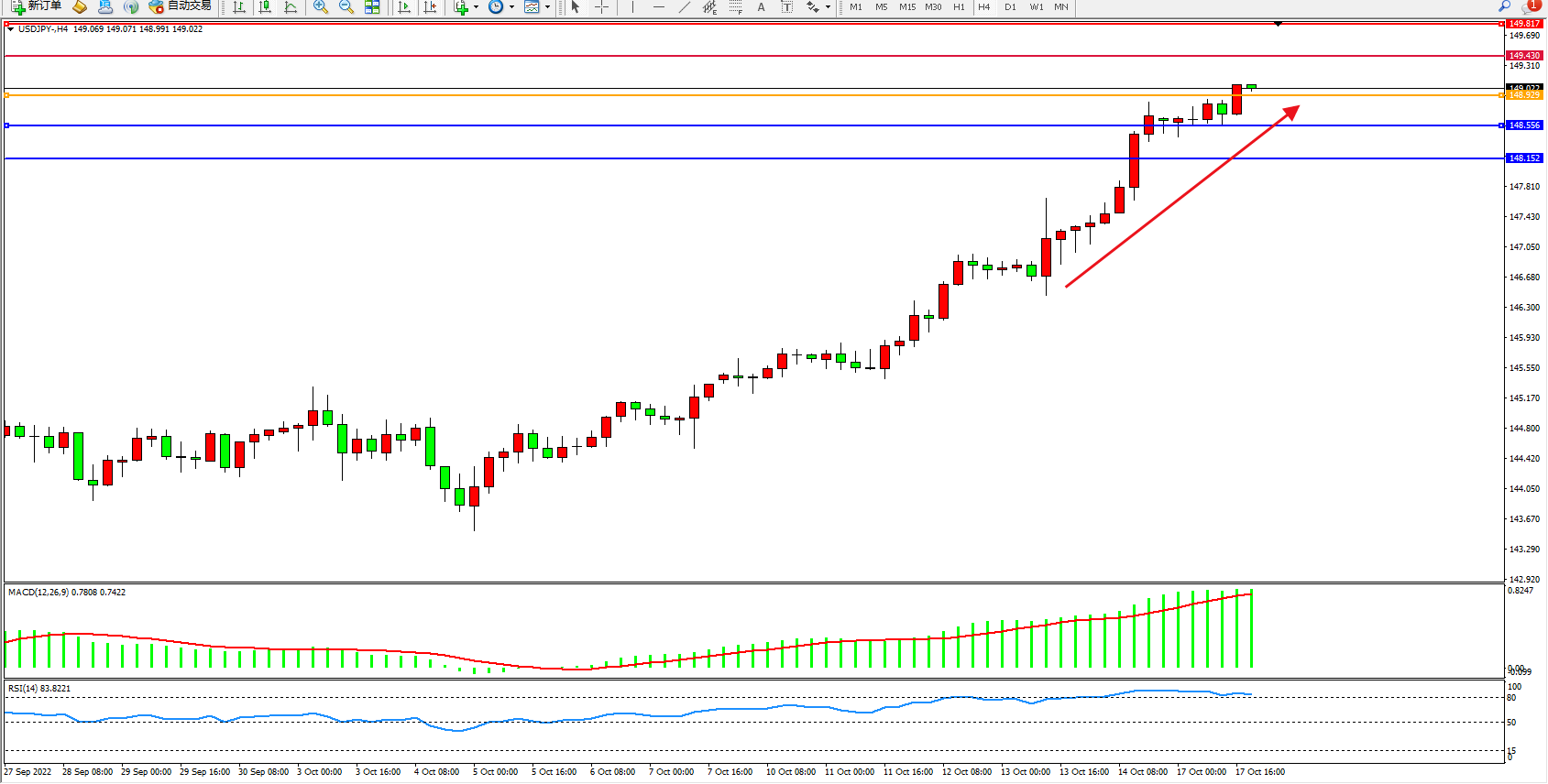 美元日圆USDJPY——4小时K线图显示: