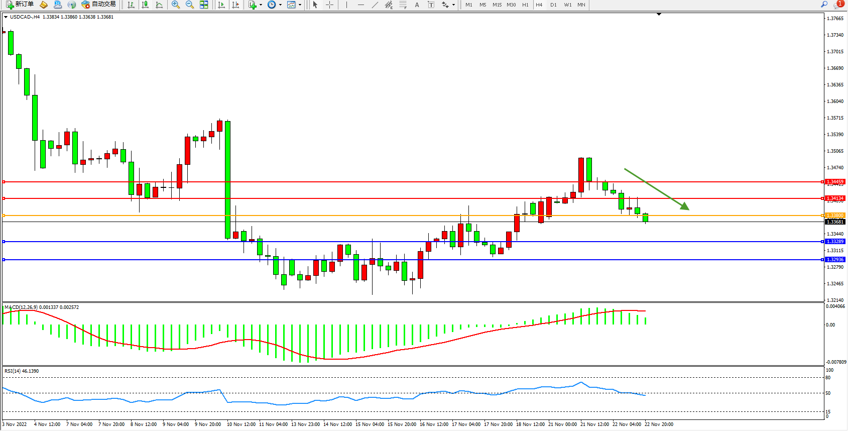 4小时图看:空头动力持续震荡下行,短期有持续向下移动态势,MACD指标处于多头区域整理下移,RSI指标处于50均衡线附近弱势徘徊中;