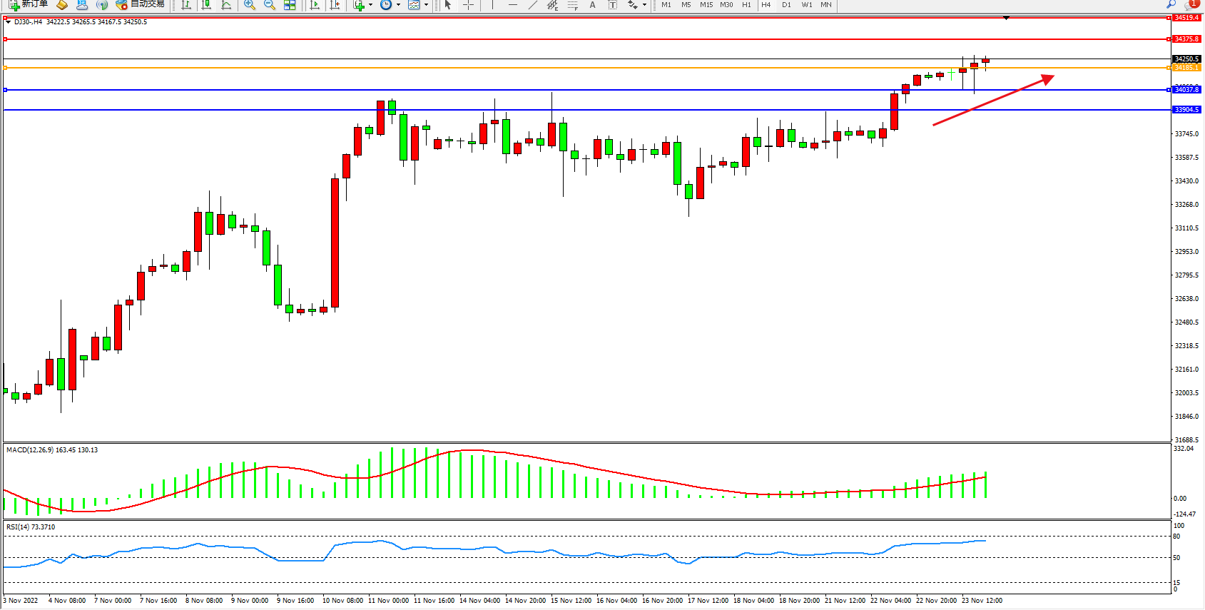 道琼斯指数DJ30——4小时K线图显示: