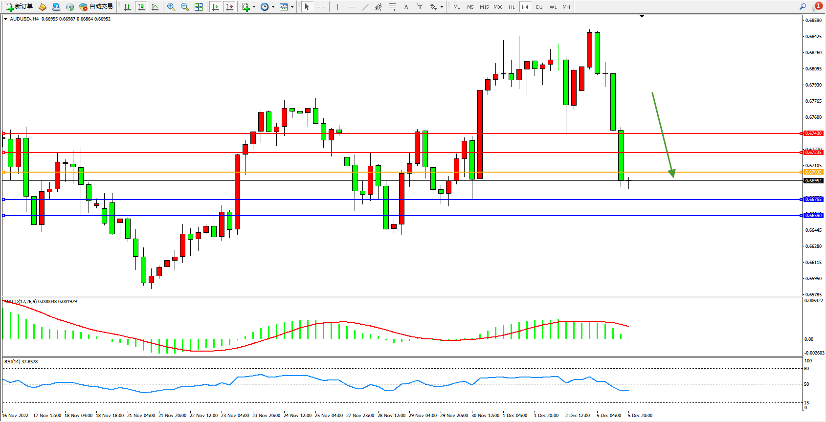澳元美元AUDUSD——4小时K线图显示:
