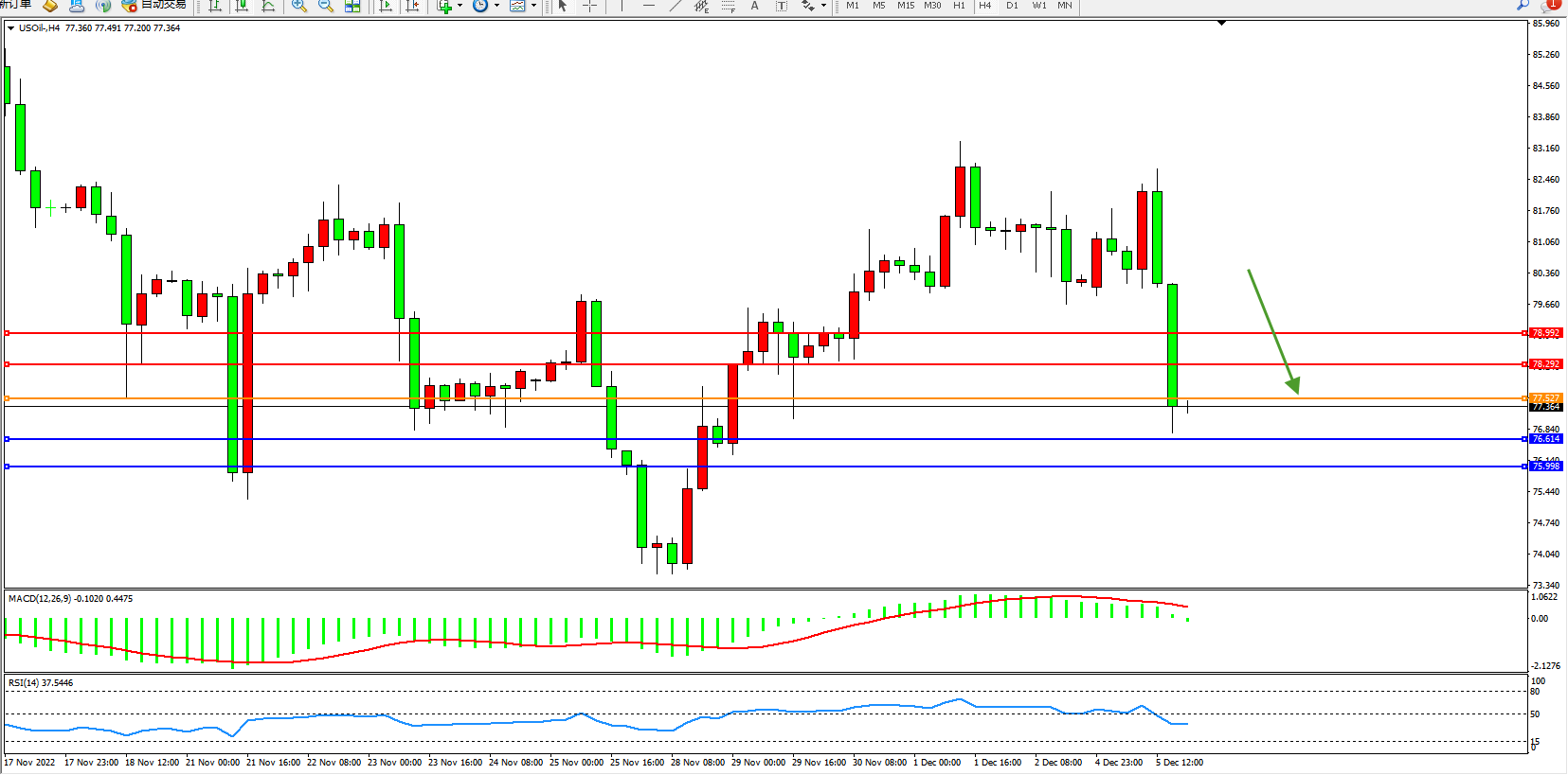 交易策略:77.527下方看跌,目标76.614、75.998