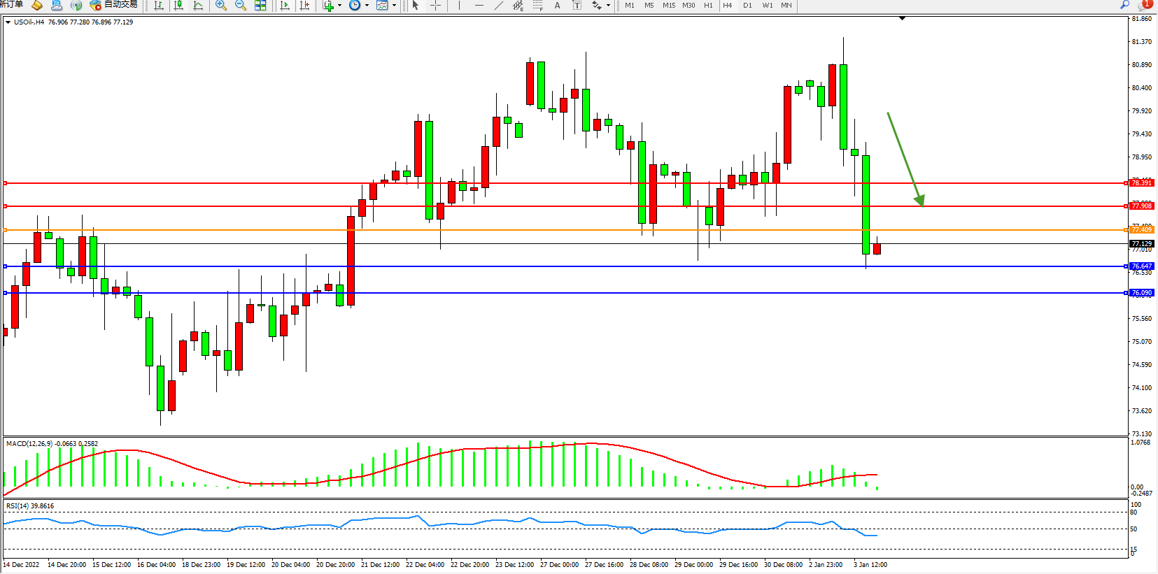 交易策略:77.409下方看跌,目标76.647、76.090