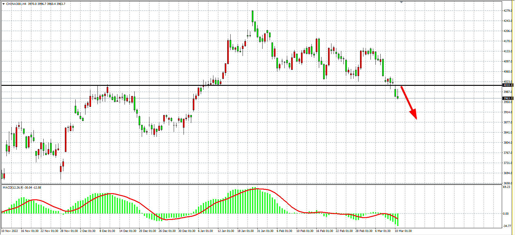 4小时图看,沪深300继续回落在4030之下运行,同时MACD于零轴之下再度放量,趋势偏向下行,阻力当前下移至4010,4010之下继续以看空为主,下方目标3920-3850附近。