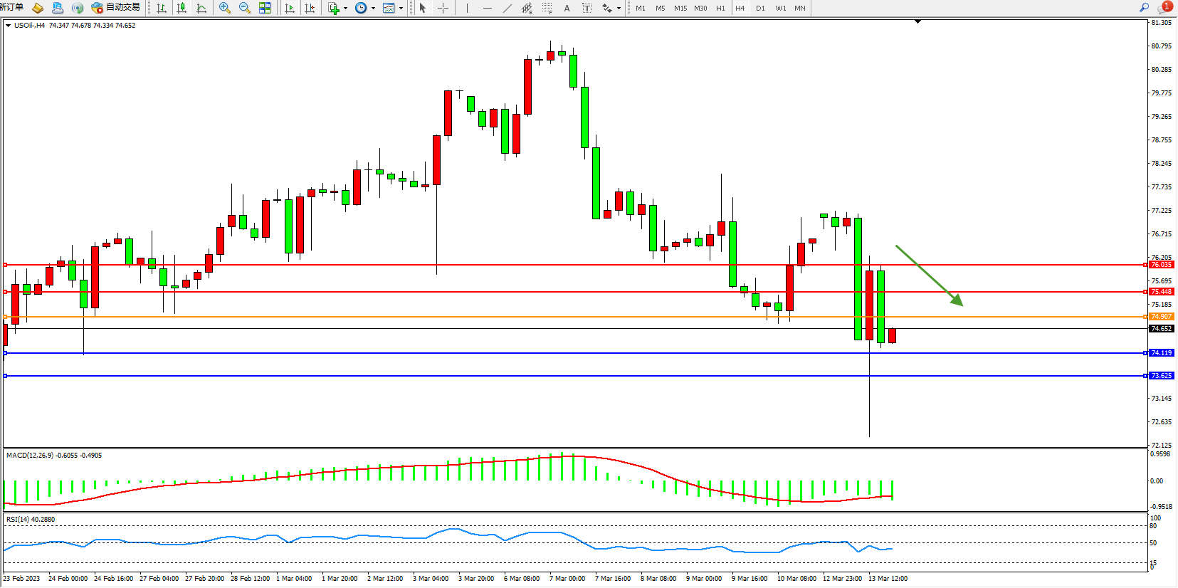 交易策略:74.907下方看跌,目标74.119  73.625
