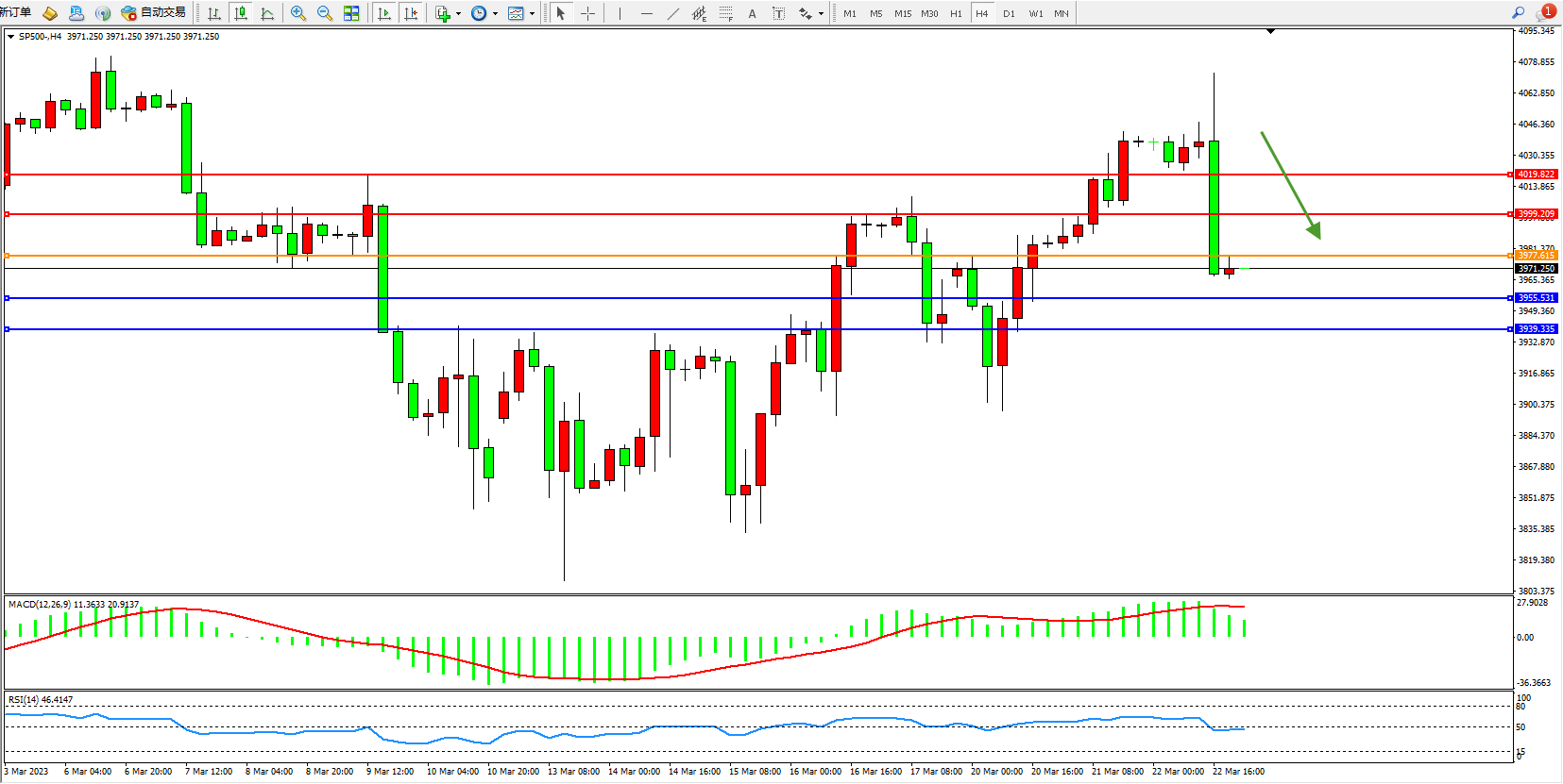 标普SP500——4小时K线图显示:
