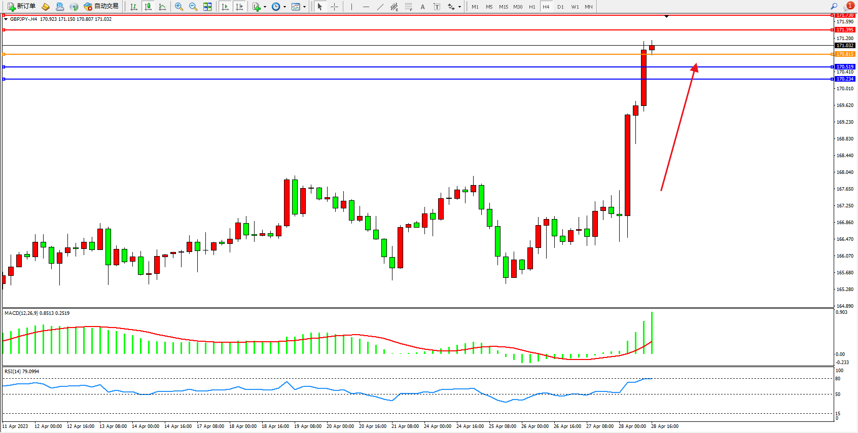 交易策略:170.815上方看涨,目标171.395  171.730