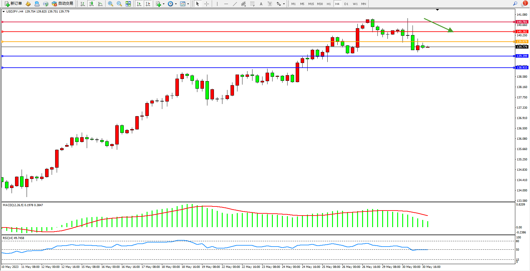交易策略:139.979下方看跌,目标139.399  138.933