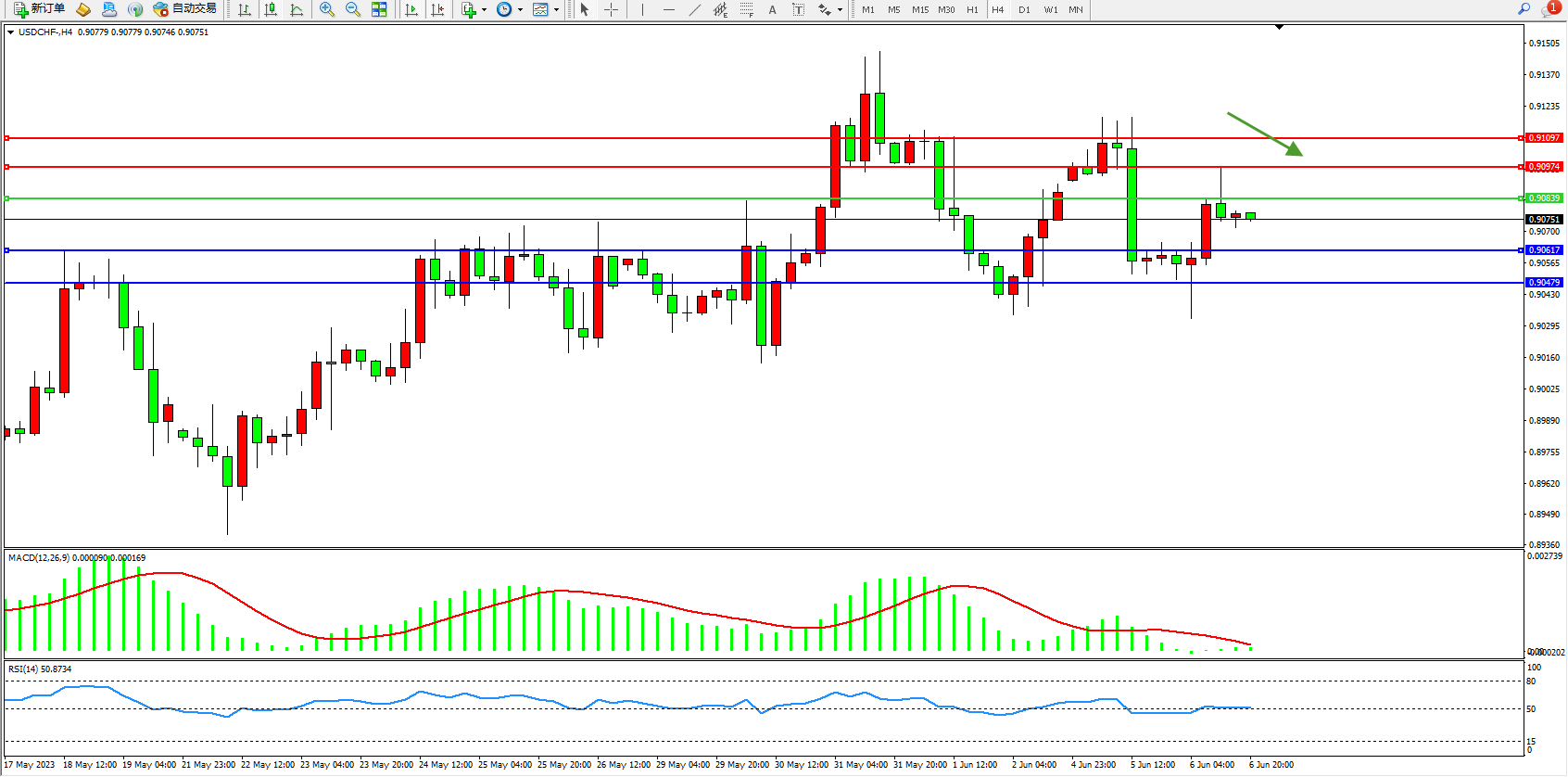 美元瑞郎USDCHF——4小时K线图显示: