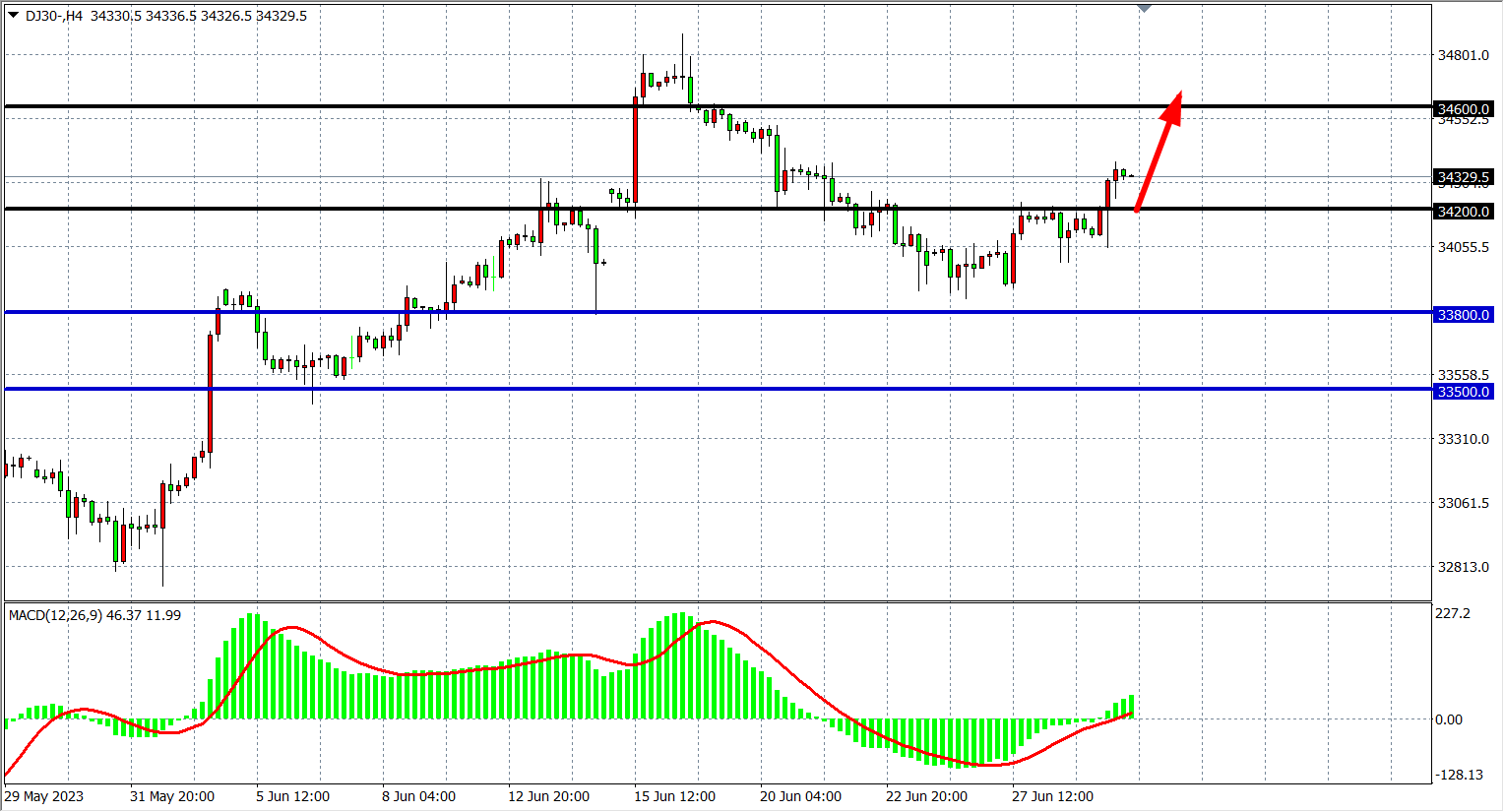 4小时图看,道指继续突破34200,反弹继续延续,MACD量能在零轴上小幅放量,下方支撑34200-33800,上方关注34600-34900。