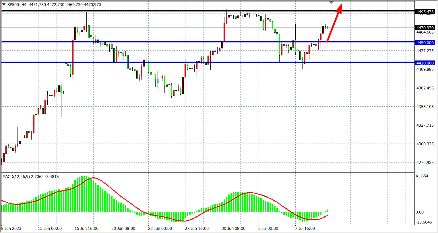 4小时图看,标普在4420之上进一步走高,MACD量能开始上穿零轴,反弹动能表现较强,支撑上移至4450-4420,上方阻力4490-4520