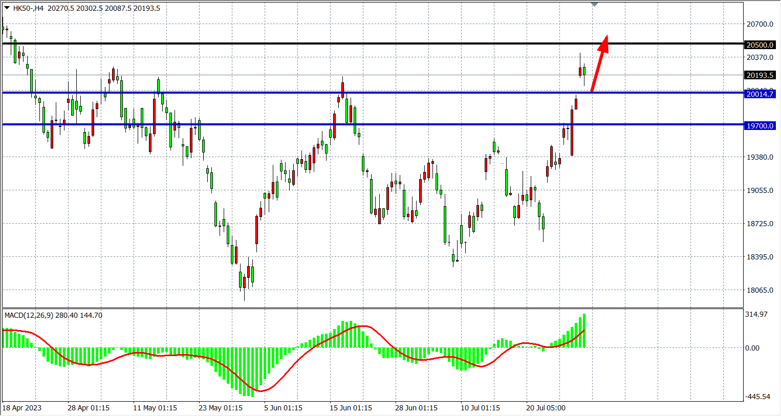 4小时图看,恒指维稳在2000关口之上,MACD量能在零轴上继续放大,支撑继续关注2000关口,该位之上看20500-20800附近。