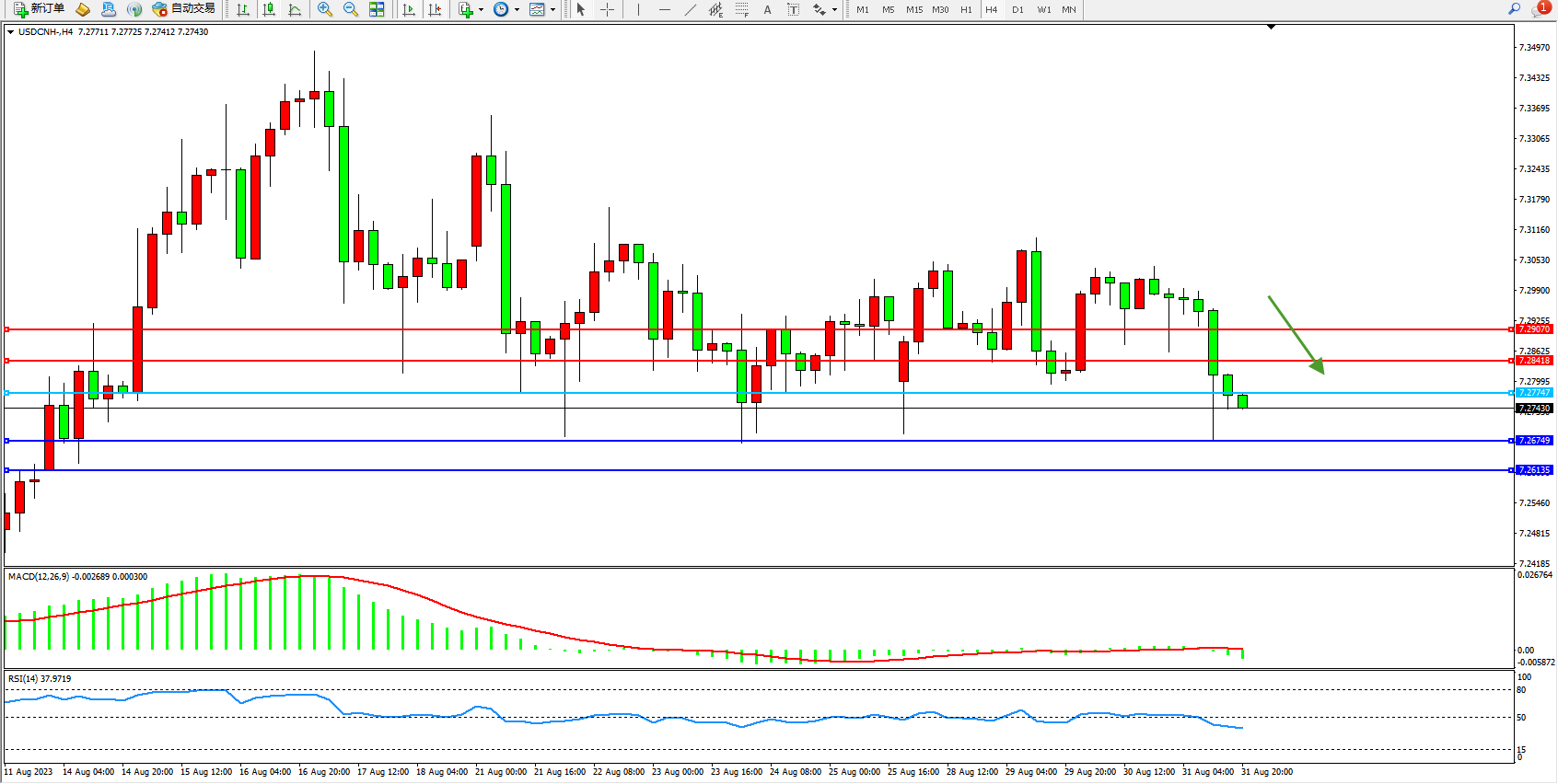交易策略:7.27747下方看跌,目标7.26749 7.26135