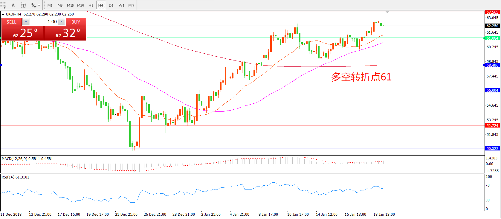 4 小时图看,油价经过连续整理站稳61美元,短期整理后受制于63美元关口, 均线系统呈多头排列, MACD红柱增加,重点关注上方阻力。