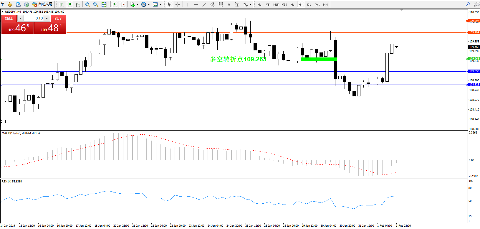 美元兑日元周呈现探底回升的走势,一度日线级别六连阴,最低曾触及108.49,最终收报109.50,周线基本收平;因为1月美国制造业指数从12月的54.3升至56.6,也令美元对于提供支撑。美国经济学家Michael Pearce表示,ISM制造业指数反弹,进一步确认经济增长在2019年初保持稳健;预计全球需求走弱和美元走强将合力在2019年给制造业构成拖累,但很明显,制造业活动并没有跌落悬崖。