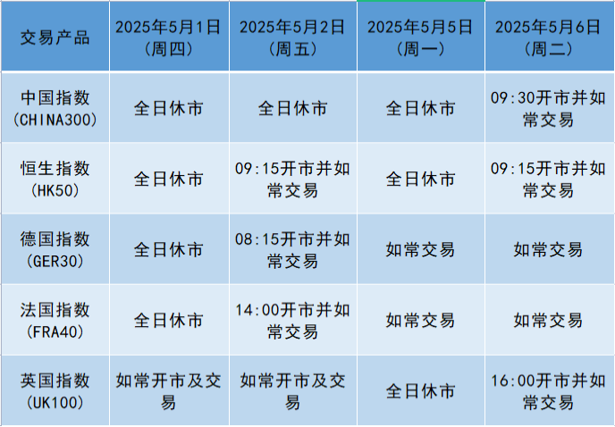 因应2025年5月1日(周四)及2025年5月5日(周一) 为劳动节和英国银行及香港佛誕假期关系,本公司以下产品的交易时间将于假期期间作以下安排,敬请留意。