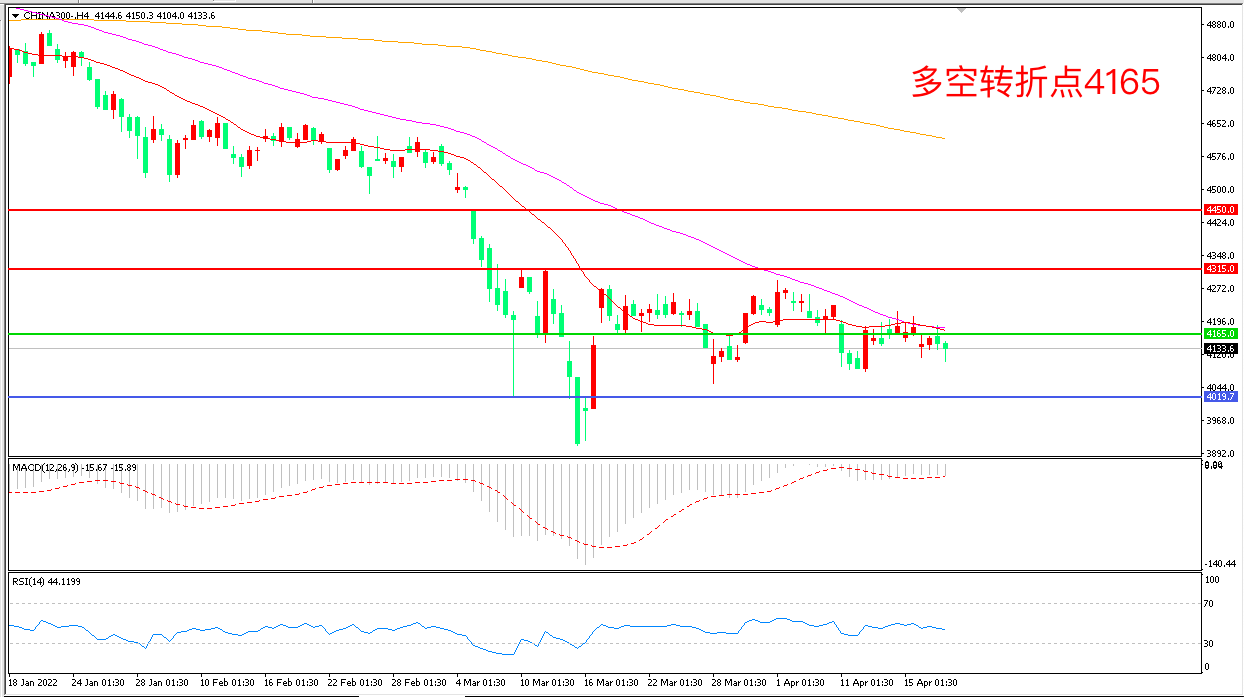 4小时图看,沪深300延续低位震荡,整体仍受制于55周期均线,4165成为多空分水岭,MACD绿柱增加,RSI指标走平,日内震荡下行概率较大。