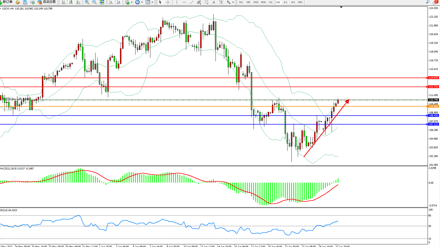 交易策略:108.426上方看涨,目标112.731、114.075