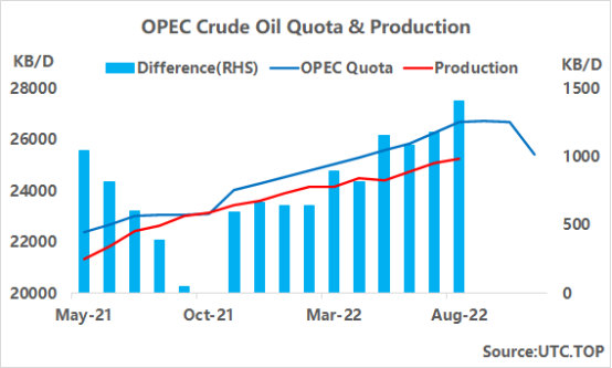 OPEC和包括俄罗斯在内的联盟在维也纳联合部长级会议上宣布,将原油日产量从 2022年8月的产量水平下调200万桶/天,该决定将从11月开始生效。